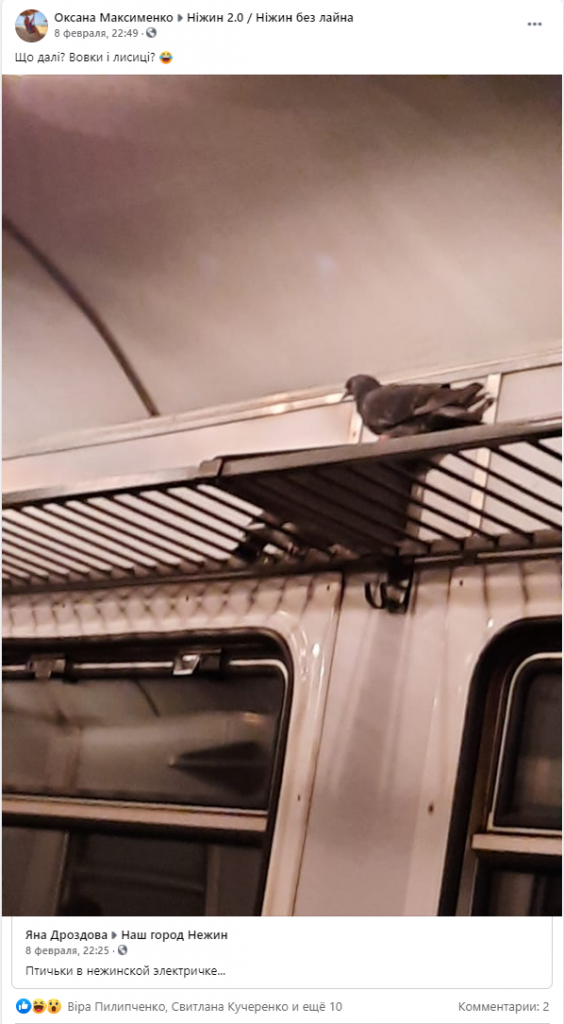 Уважні ніжинці побачили в електричці, що прямує з Ніжина незвичайного пасажира. Голуб, угрівшись, сидів на полиці для багажу. Поряд знаходилось ще декілька. Мабуть, поїхали до Києва шукати кращого життя)