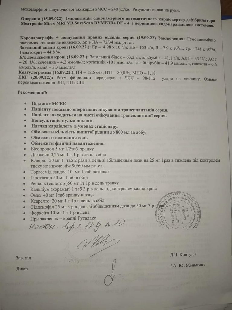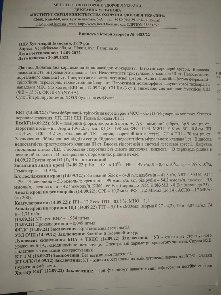 «Доброго дня, ніколи не думала що звернуся за допомогою, але велике горе прийшло в нашу сім’ю . Мій чоловік Бут Андрій Іванович отримав страшний діагноз дилатаційна кардіоміопатія та багато супутніх діагнозів .( документи для ознайомлення прикриріплю). Він потребує термінової пересадки серця та довготривалої реабілітації.Потрібна сума є великою для нашої сім’ї, тому дуже прошу всіх небайдужих про допомогу .Допоможіть врятувати люблячого тата та коханого чоловіка🙏🙏🙏. Заздалегідь дуже ДЯКУЮ всім хто в такий складний для кожного час, не залишиться осторонь нашої біди .